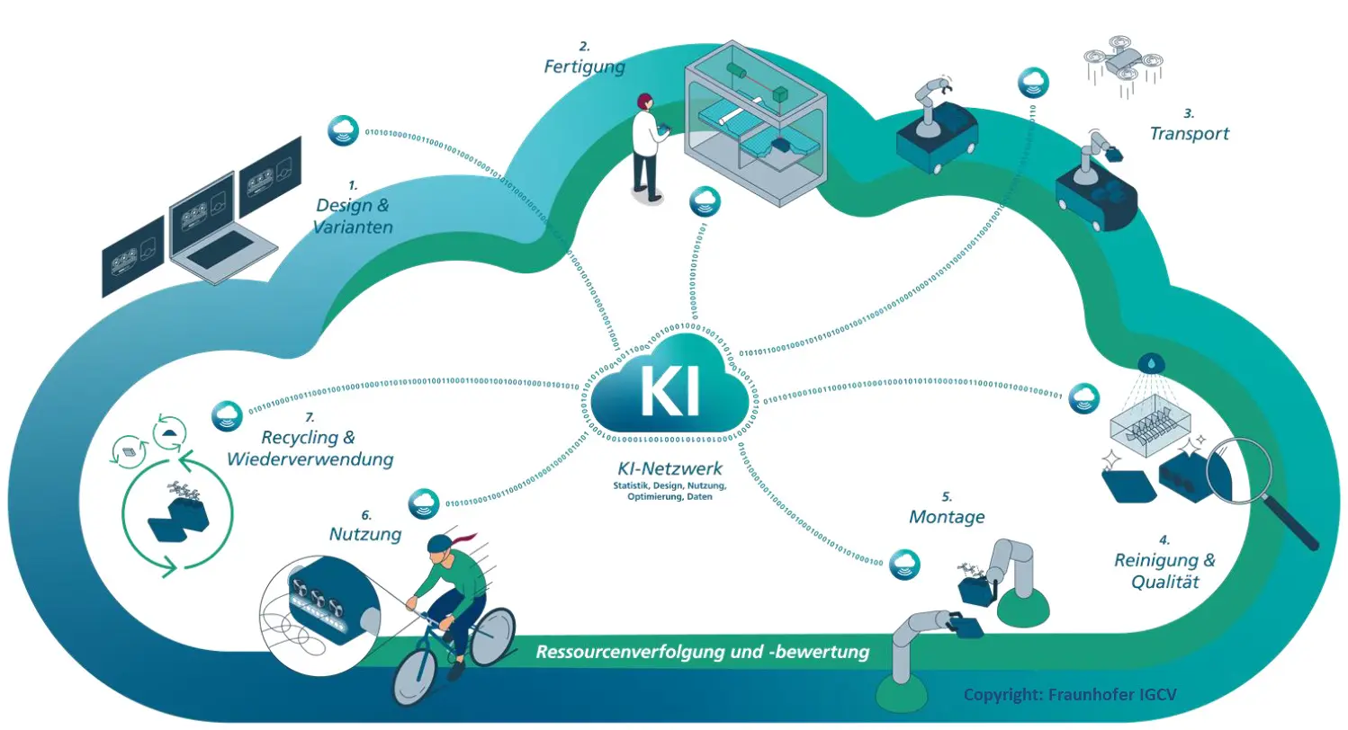 Wir unterstützen Sie dabei, Ihre Wertschöpfungsprozessketten zu optimieren und vernetzte Lösungen zu gestalten. Gemeinsam mit Ihnen entwickeln wir ein nachhaltiges Produktionsnetzwerk, bei dem wir sowohl die Schlüsselprozesse weiterentwickeln als auch maßgeschneiderte KI-Anwendungen (z. B. Prozessüberwachung) für Ihre spezifischen Anforderungen entwickeln.