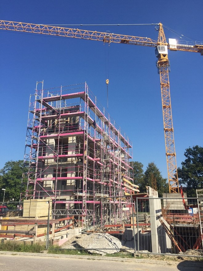 Auf der Kellerdecke steht eine 4-geschossige Holzbaukonstruktion mit 18 Wohnungen zuzüglich Dachaufbau und einem Gemeinschaftsraum im Erdgeschoss.