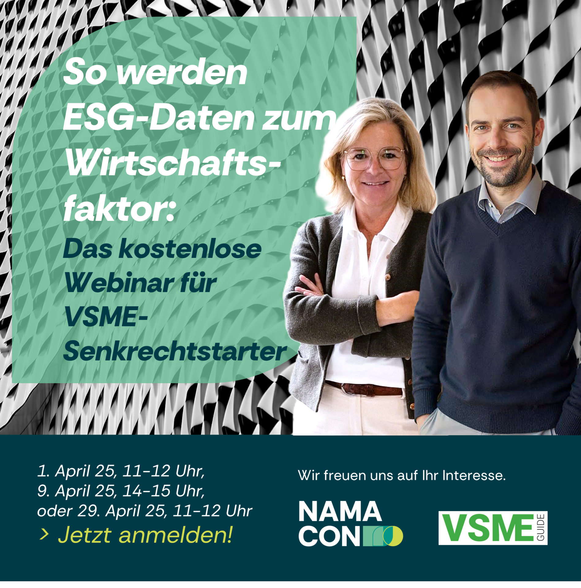 NAMACON | Beratung für nachhaltiges Management und Unternehmensentwicklung und VSME-guide.com geben in einem kompakten Webinar klare Antworten auf die wichtigsten Fragen: Warum wird ESG-Scoring für KMU zum entscheidenden Kriterium? Welche Erwartungen haben Banken, Versicherungen und Geschäftspartner? Wie gelingt ein schneller und konformer Einstieg in die ESG-Berichterstattung? Wie unterstützt das KI-gestützte Tool „VSME-Guide“ bei einer einfachen und rechtssicheren Umsetzung? Welche Kosten entstehen – und warum rechnet sich die Investition?