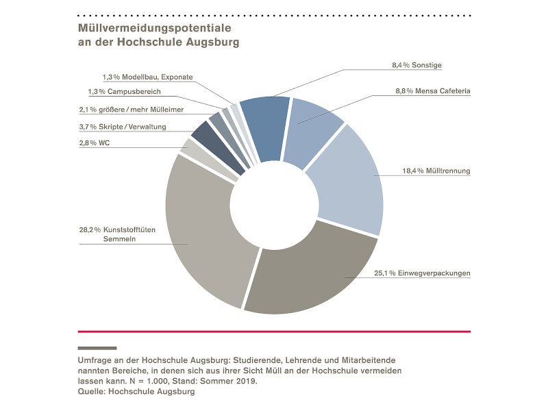 Bei der Erstellung der Ökobilanz wurde deutlich, wo der größte Anteil des Müllaufkommens der Hochschule Augsburg liegt (s. Grafik), und dass ein Großteil unmittelbar von den Studierenden und Mitarbeitenden herrührt. Die Umfrage traf auf ein unerwartet hohes Beteiligungsinteresse: 1.069 Hochschulangehörige beantworteten Fragen zu ihrem Individualverhalten und zu aus ihrer Sicht notwendigen Verbesserungsmaßnahmen. 93 Prozent gaben an, dass ihnen Abfallvermeidung wichtig ist, und lediglich nur 37 Prozent waren der Meinung, dass es an der Hochschule Augsburg genügend Möglichkeiten gibt, Müll zu vermeiden.