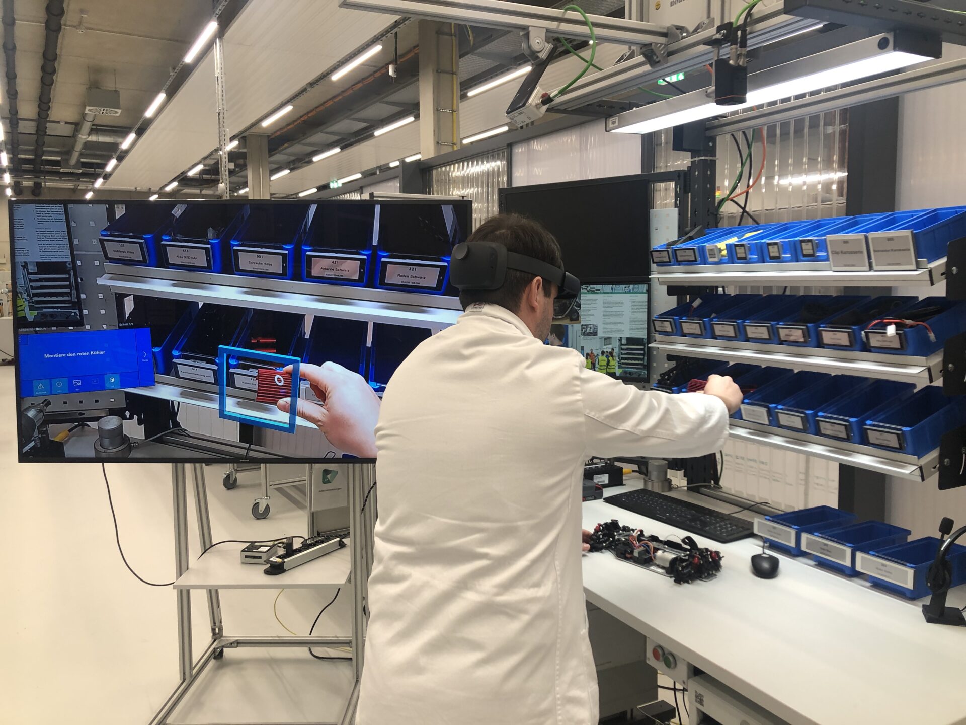 Durch die Überlagerung der Realität mit augmentierten Hinweisen können Informationen situationsspezifisch und ortsverknüpft dargestellt werden. So können Transferleistungen für Mitarbeiter minimiert werden. Head Mounted Displays (HMD) kommen in der Industrie, aber auch in Bereichen wie Medizin, Militär und Sport immer häufiger zum Einsatz, da beide Hände frei bleiben. Laut Alex Kidman, leitender Entwickler bei Microsoft, nutzen bzw. testen bereits 60% der 500 umsatzstärksten Unternehmen der USA die HoloLens 2 von Microsoft, was diesen Trend verdeutlicht. Verschiedene Studien konnten bereits nachweisen, dass Montageprozesse mithilfe von AR-Leitsystemen schneller erlernt werden können und zu einer geringeren Fehlerquote führen. AR-Leitsysteme sind bereits auf dem Markt erhältlich und eignen sich als Assistenzsysteme, jedoch nur bedingt zur Qualifizierung von Mitarbeitern. Mitarbeiter werden Schritt-für-Schritt durch die Montage geleitet und lernen den Prozess zwar kennen, bleiben aber oft auf die Unterstützung durch AR-Animationen angewiesen.