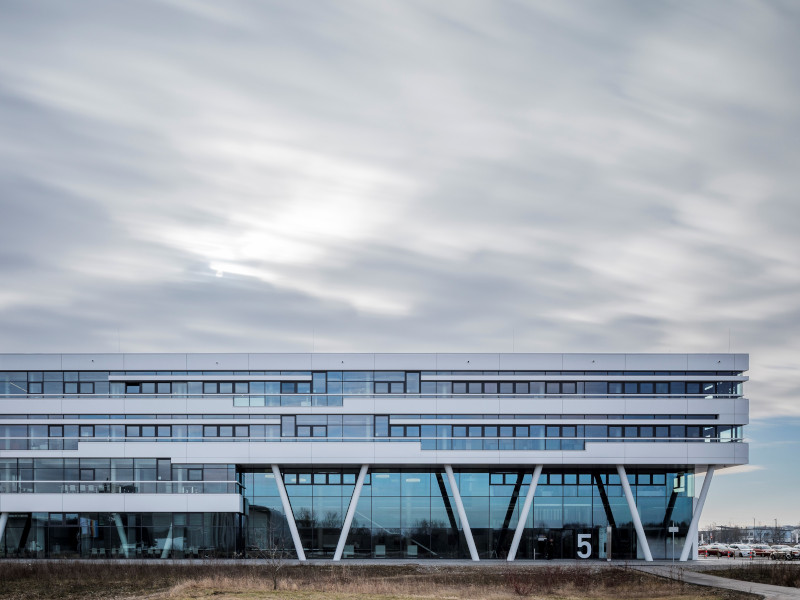 Auch das Gebäude wurde nach Nachhaltigkeitskriterien konzipiert. Wie im Außenbereich, wurden bei der flächensparenden, kompakten Bauweise langlebige Materialien verwendet. Das spiegelt das Konzept Innovationspark GmbH wieder, wie Hehl sich äußert: „Das Thema Ressourceneffizienz, also der kluge und sparsame Umgang mit Materialien und Energie, gehört zu den Kernkompetenzfeldern des Augsburg Innovationspark.“ Dem entspricht auch die Unterschreitung der EnEV 2014 um mindestens 15%. Eine hocheffizient beschichtete Dreifachverglasung, die 100kWp PV-Anlage, eine energieoptimierte Kompressor-Anlage, regulierte Beleuchtung oder Wärmerückgewinnnung in der Lüftung sind unter anderem dafür verantwortlich. Des Weiteren wird das Gebäude durch die Nutzung von Fernwärme aus hocheffizienten Kraft-Wärme-Kopplungsanlagen beheizt. Die Kühlung wiederum geschieht mit Hilfe von Brunnenwassernutzung in Kombination mit Heiz- und Kühldecken. Die Dachbegrünung sieht nicht nur „grün“ aus, sondern fungiert als Regenwasserspeicher und Isolierung der Deckenfläche.
