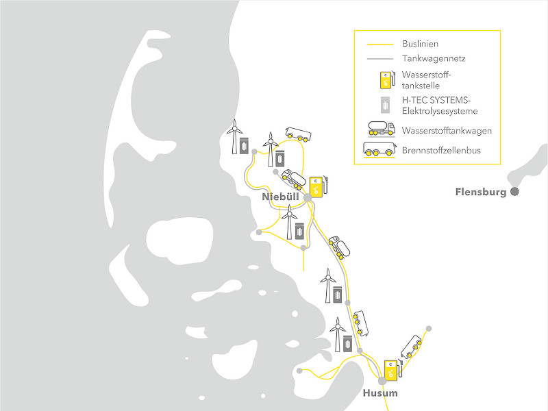 Die Produktion des Wasserstoffs wird an fünf existierenden Windenergie-Standorten erfolgen, der Wasserstoff wird also Treibstoff an zwei neu errichtete, selbst von eFarming betriebene öffentliche Wasserstofftankstellen in Niebüll und Husum mittels eigener Logistik geliefert. Zum ersten Mal wird so die gesamte regional Wertschöpfungskette in einer Hand betrieben.