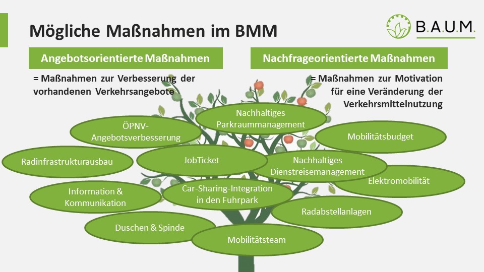 Das heißt, hier ist noch einige Luft nach oben für eine Vermeidung von Verkehren, für eine Verlagerung hin zu Verkehrsmitteln aus dem Umweltverbund bzw. für eine verträgliche Abwicklung des Verkehrs, etwa durch den Umstieg auf alternative Antriebe. Und genau hier setzt das betriebliche Mobilitätsmanagement mit seinen Handlungsfeldern und Maßnahmen an. Aus unserer alltäglichen Arbeit mit Unternehmen kennen wir viele gute Beispiele, bei denen die betriebliche Mobilität durch gezielte Förderung und verschiedene Angebote nachhaltiger geworden ist.