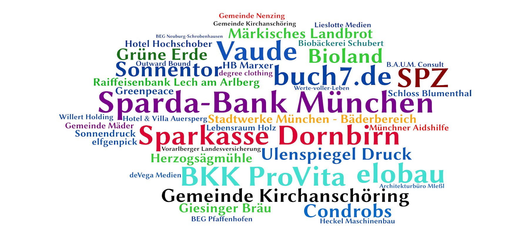 Architekturbüro Mießl, Biobäckerei Schubert, buch7.de, Contecta Hausverwaltung, degree clothing, deVega Medien, elfgen pick GmbH, HBPlus Dinkelscherben Steuerberatungs GmbH, Herzstück Horgau eG, Lieslotte Medien, Schloss Blumenthal, Werte-voller-Leben, Willert Holding, Bio-Hotel Bayerischer Wirt