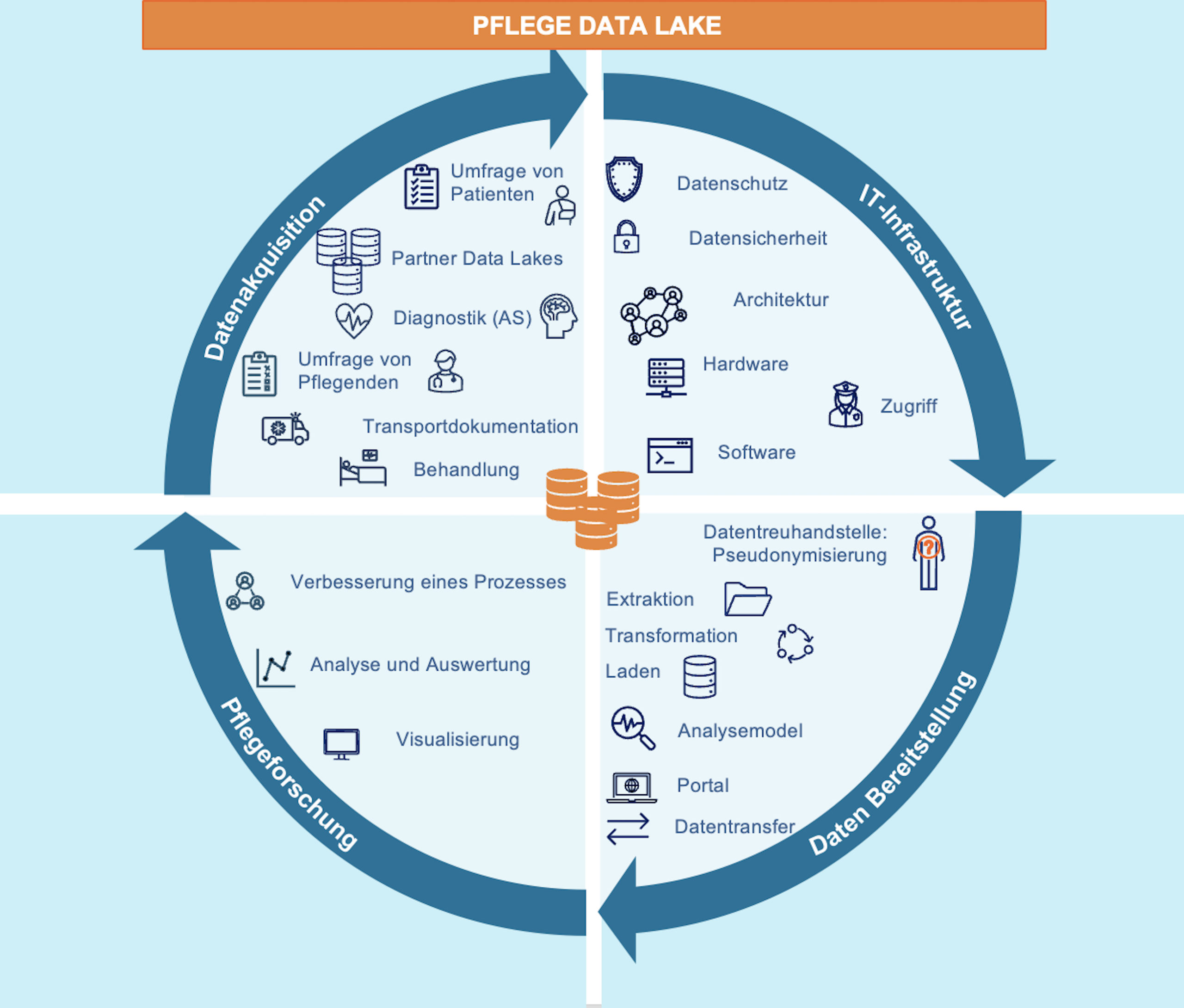 Die Hochschule Augsburg ist durch ihr Fachwissen im technischen Bereich für die Digitalisierung der Pflegeüberleitungsberichte verantwortlich und arbeitet hierbei eng mit dem Universitätsklinikum Augsburg zusammen. Hier wird zusätzlich eine Online-Plattform zum Austausch pflegerelevanter Daten bereitgestellt und eine Testumgebung zur Prototypisierung von assistiven Systemen geschaffen. Die Universität Augsburg hingegen konzipiert, entwickelt und evaluiert eine institutsübergreifende Datenbank zur Sammlung harmonisierter Pflegedatensätze und zeigt durch die Analyse dieser Daten Verbesserungspotenziale in der Pflege auf (siehe Abbildung).