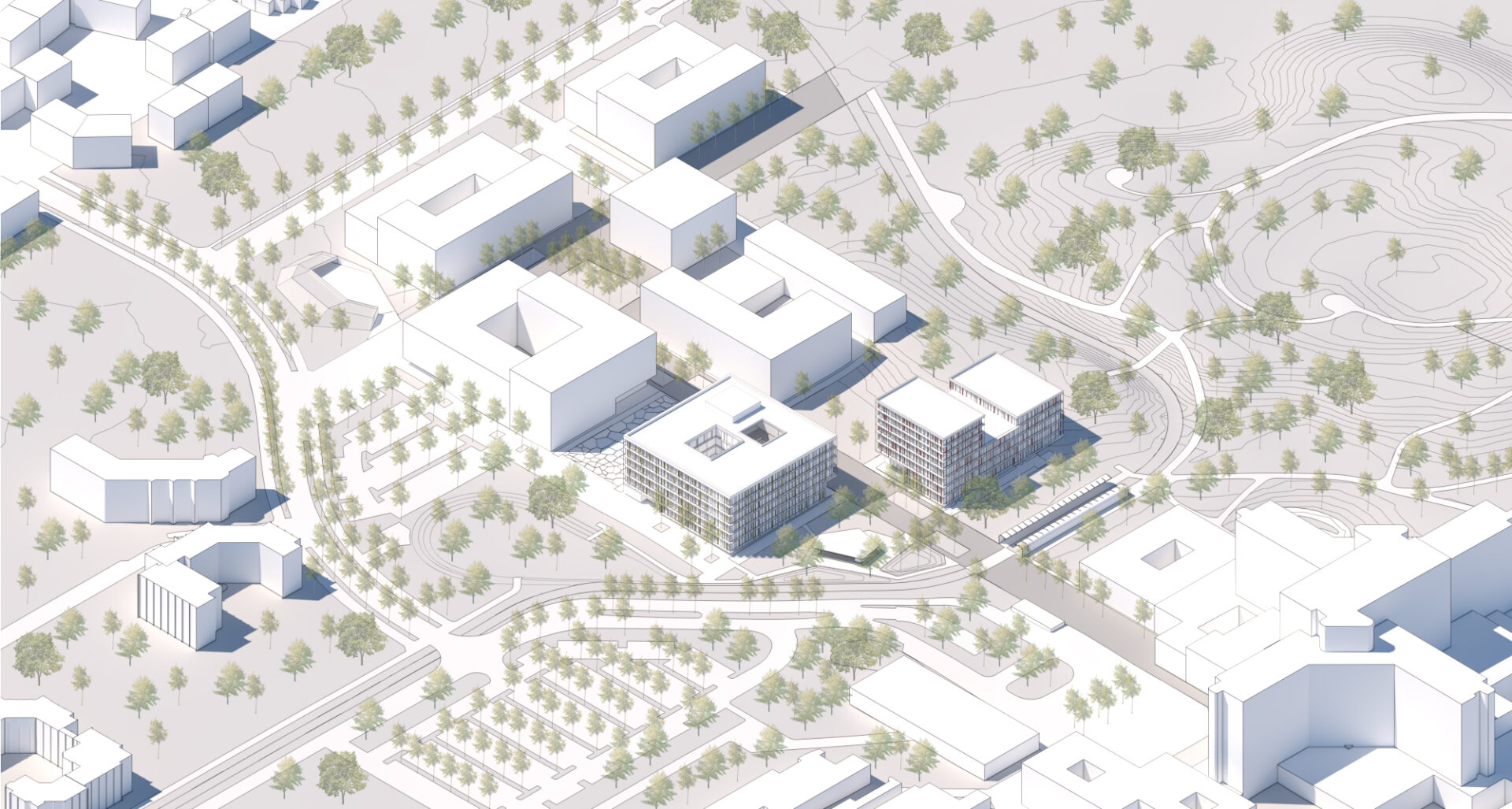 Der gesamte Campus ist entlang einer Promenade aufgereiht, die in Nord-Süd-Richtung verläuft und die Neubauten mit Bestandsstrukturen verbindet, wie etwa dem Patientengarten und dem Universitätsklinikum. Abwechslungsreiche Raumstrukturen schaffen eine hohe Aufenthaltsqualität und werden so zu einem kommunikativen Begegnungsraum: Eine Campuswiese, Spiel- und Sportgeräte sowie schattige Sitzgelegenheiten unter Bäumen und eigens gestaltete Außenmöbel laden zum Verweilen ein. Im Sinne der Nachhaltigkeit gibt es ein großes Angebot an Fahrradabstellmöglichkeiten mit begrünten Dächern sowie Lademöglichkeiten für E-Bikes. Die Neubauten Lehrgebäude und Institut für Theoretische Medizin ITM bilden im Norden den städtebaulichen Auftakt des Campus und schaffen mit dem Entréeplatz und einem Baumhain einen ersten, einladenden Außenraum.