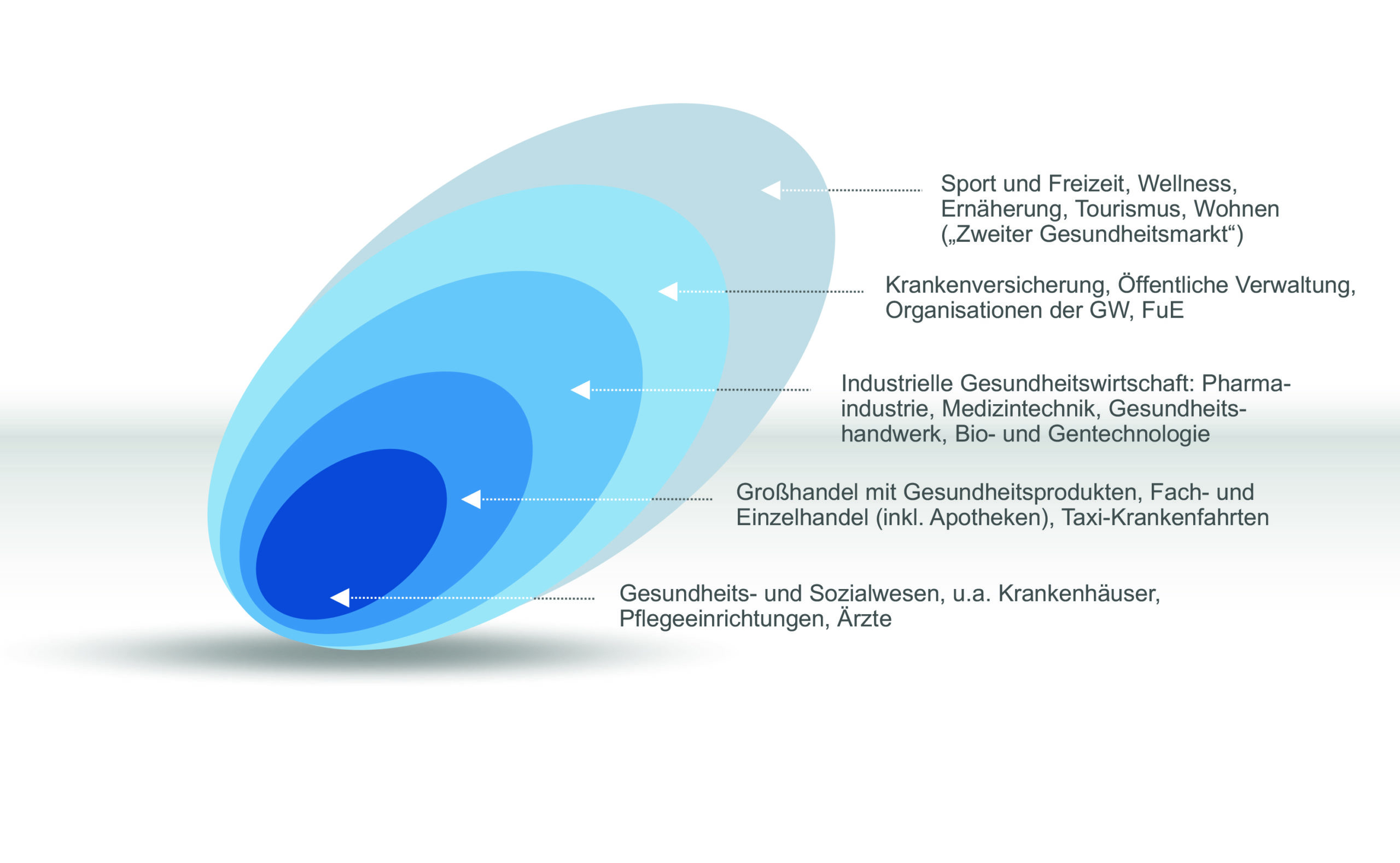Im engeren Sinn zählen zur Gesundheitswirtschaft das Gesundheits- und Sozialwesen (also z. B. Kliniken, Pflegeheime und Ärzte), der Groß- und Einzelhandel mit Gesundheitsprodukten, Industrie- und Handwerksbetriebe sowie Dienstleistungsunternehmen (z. B. Pharmaindustrie, Medzinitechnik oder Optiker) und die Krankenversicherungen sowie Forschung und Entwicklung. Als "zweiter Gesundheitsmarkt" werden Branchen bezeichnet, die mittelbar der Gesundheit dienen. Dazu zählen z. B. Einrichtungen für Sport- und Freizeit, Wellness und Ernährung aber auch Teile des Tourismus.