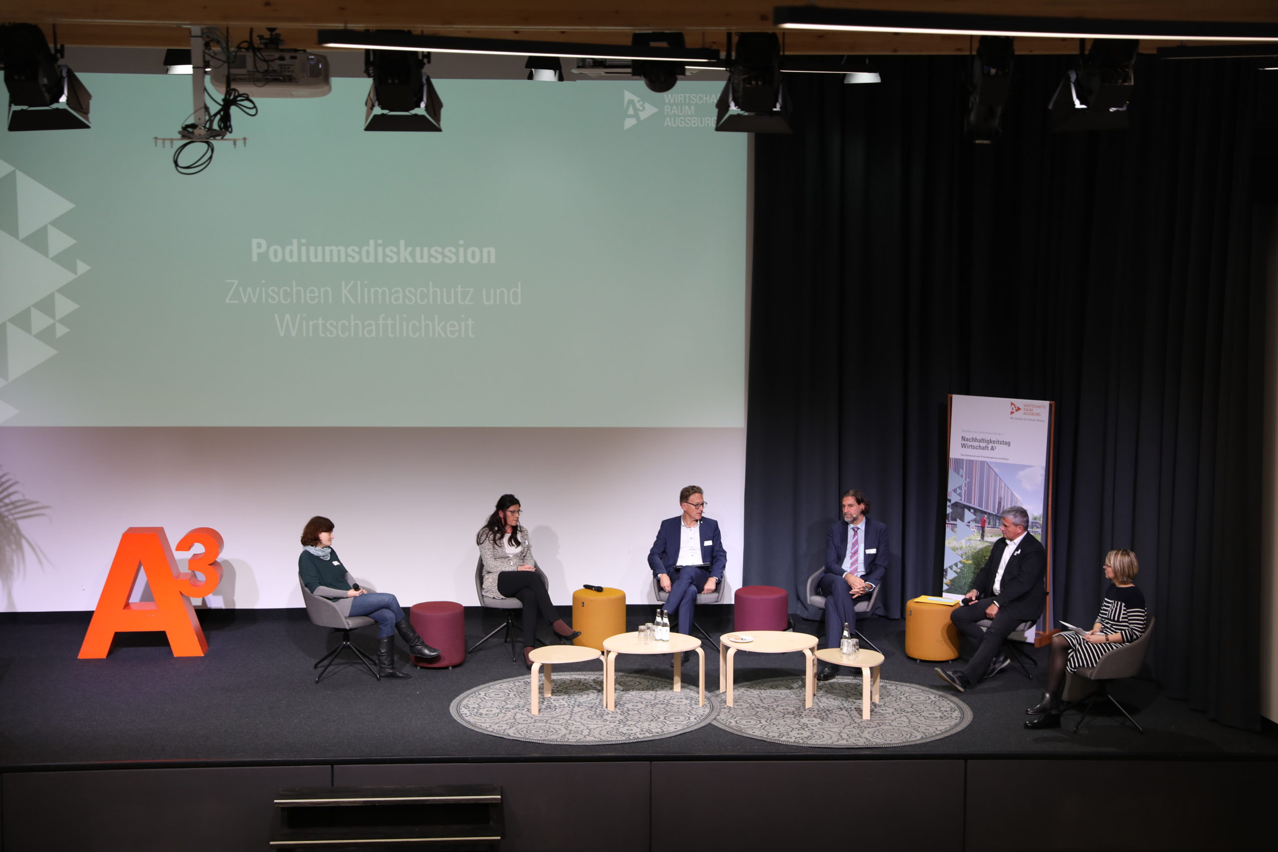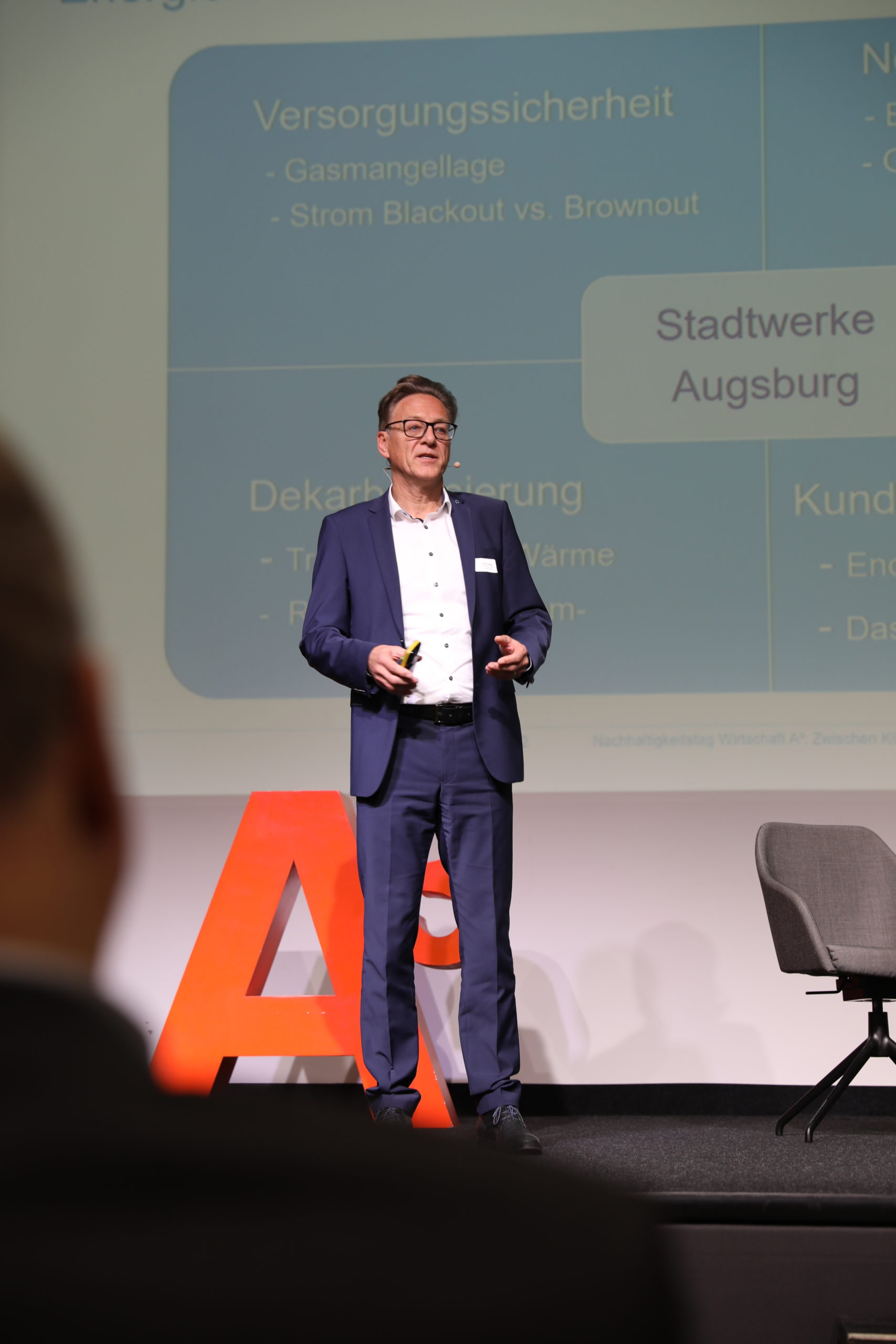 Bereits zum sechsten Mal fand am 22.11.2022 der Nachhaltigkeitstag Wirtschaft A³ statt. Knapp 100 Gäste waren ins Westhouse Augsburg gekommen. Mit dem Thema „Zwischen Klimaschutz und Wirtschaftlichkeit“ wurden die Teilnehmer darüber informiert, wie Klimaschutz und Nachhaltigkeitsengagement mit Wirtschaftlichkeit vereinbart werden können. Neben dem Hauptredner Prof. Dr. Andreas Löschel gab es einen weiteren Impuls von Ulrich Längle, dem Vertriebsleiter der Stadtwerke Augsburg, und eine spannende Podiumsdiskussion. Im Anschluss diskutierten die Teilnehmer an sechs Thementischen mit weiteren Experten verschiedene Aspekte von Klimaschutz. Im Vordergrund standen hier der Austausch und die Vorstellung guter Beispiele aus der Region Augsburg.