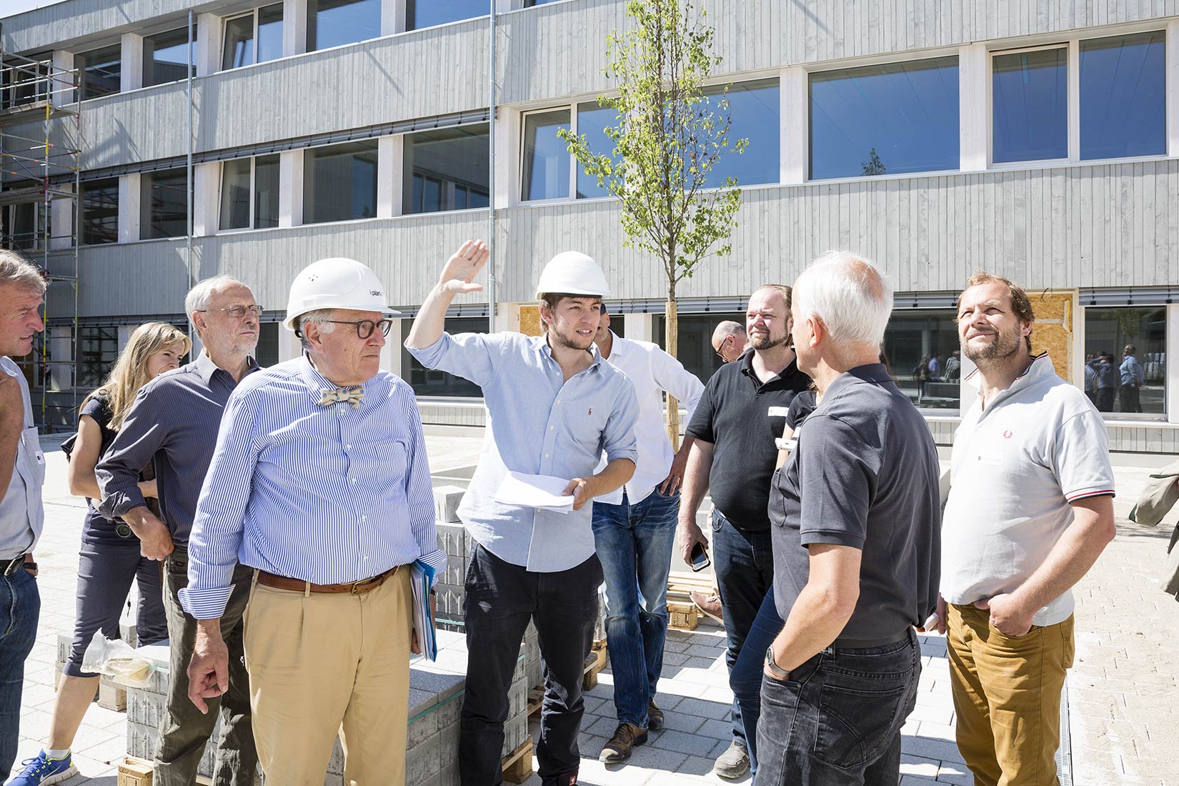 Die ersten Gebäude stehen bereits, bei unserem Besuch am 14. Oktober werden sich gerade weitere Gebäude im Bau befinden. Durch die Baustelle führen Frank Lattke, lattkearchitekten, und Alexander Gumpp für das ausführende Holzbauunternehmen Gumpp & Maier.