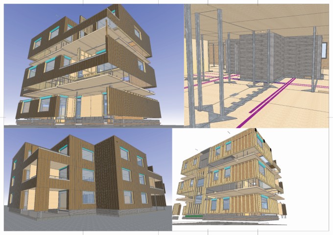 Auf der Kellerdecke steht eine 4-geschossige Holzbaukonstruktion mit 18 Wohnungen zuzüglich Dachaufbau und einem Gemeinschaftsraum im Erdgeschoss.