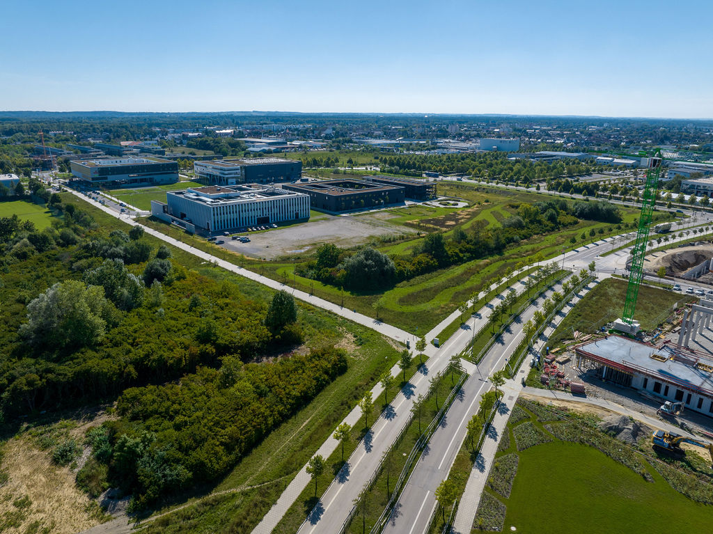 Im Augsburg Innovationspark werden langfristig landschaftsarchitektonische Elemente, ein attraktives Arbeitsumfeld sowie qualitätsvolle Aufenthaltsräume symbiotisch miteinander entwickelt.