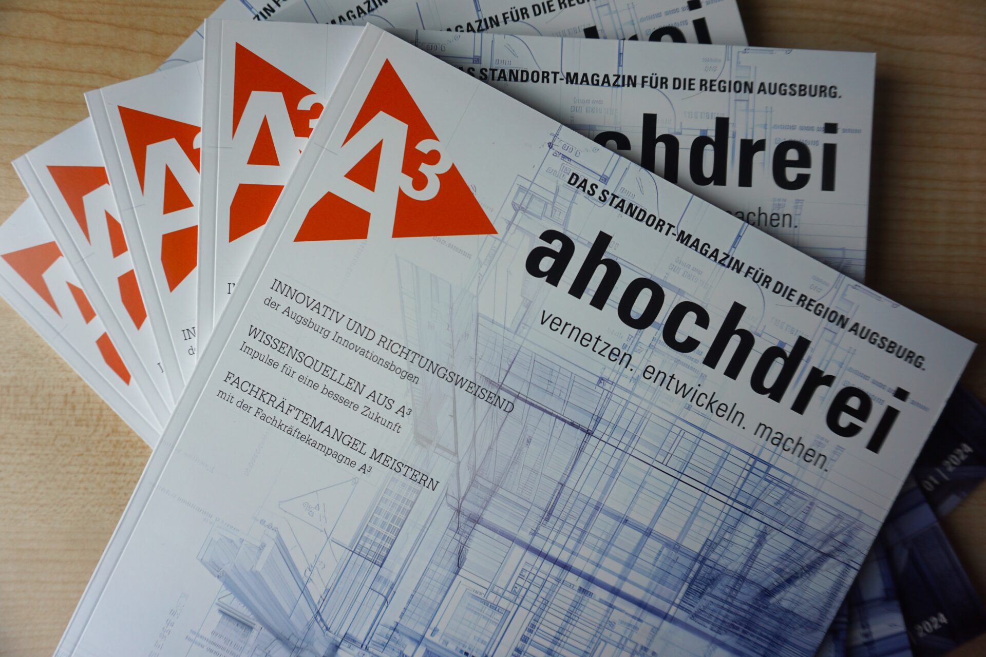 Stöbern, entdecken, lernen und inspirieren lassen – die Magazin-Reihe ahochdrei lädt Sie ein, anhand von Erfolgsgeschichten den Wirtschaftsraum Augsburg kennenzulernen. Die zwei Ausgaben pro Jahr widmen sich den Themen Standort & Immobilien, Technologie & innovation, Fachkräfte und Nachhaltigkeit. Serviceangebote runden das Magazin ab. Eine Ausgabe widmet sich immer mit dem besonderem Schwerpunkt dem Thema Standort & Immobilien.  Sie möchten eine Anzeige schalten oder haben eine spannende Erfolgsstory? Kommen Sie auf uns zu. Nutzen Sie auch die kostenlose Bestell- und Abomöglichkeit des Magazins ahochdrei.
