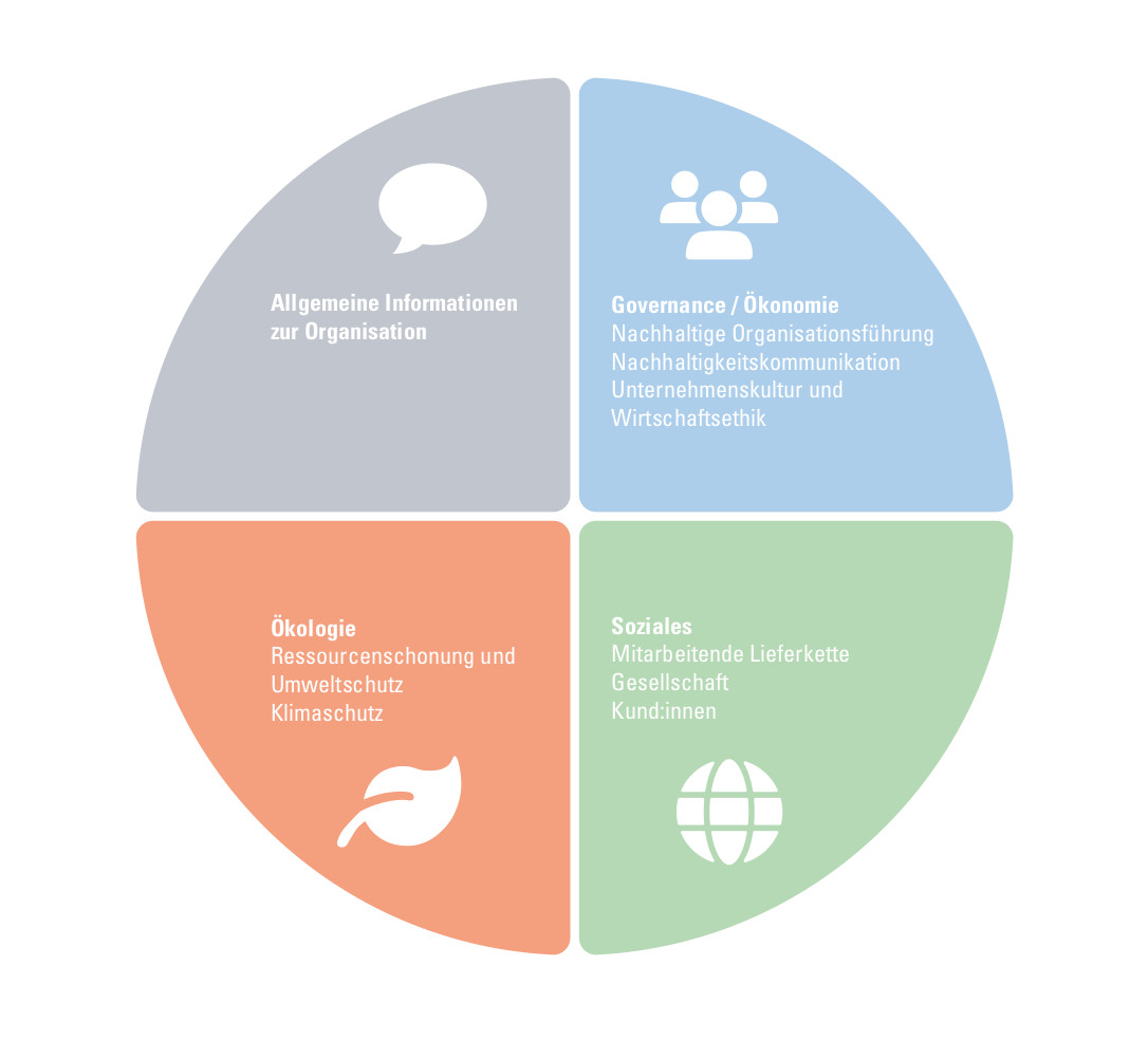 Die Umfrage des Nachhaltigkeitsmonitors umfasst drei inhaltliche Schwerpunkte - Governance /Ökonomie, Ökologie und Soziales. Darunfer finden sich 52 Fragen, die insgesamt über 200 Nachhaltigkeitsaspekte berücksichtigen.