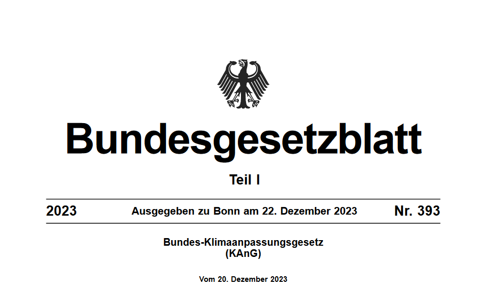 Seit dem 1. Juli 2024 gilt das bundesweite Klimaanpassungsgesetz (KAnG), das erstmals einen verbindlichen Rahmen für die Klimaanpassung in Bund, Ländern und Gemeinden schafft.