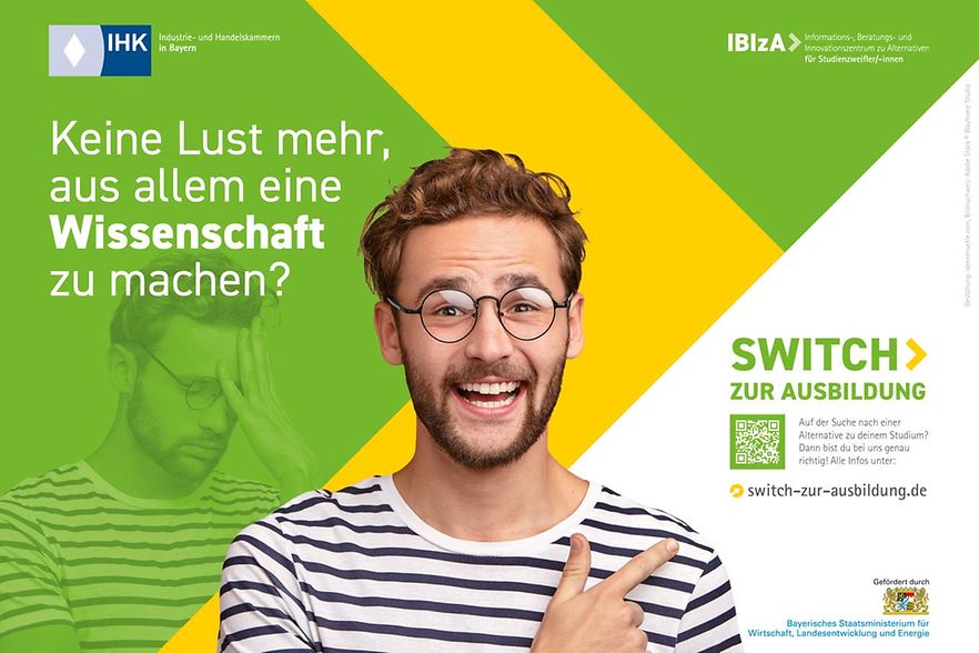 Um Studierende, die vom Hochschulsystem in das duale Aus- und Weiterbildungssystem wechseln möchten, zu unterstützen, haben die bayerischen Industrie- und Handelskammern im Jahr 2023 das Projekt „IBIzA – Informations-, Beratungs- und Innovationszentrum zu Alternativen für Studienzweifler/-innen“ ins Leben gerufen. Das Projekt wird vom Bayerischen Staatsministerium für Wirtschaft, Landesentwicklung und Energie unterstützt und gefördert.