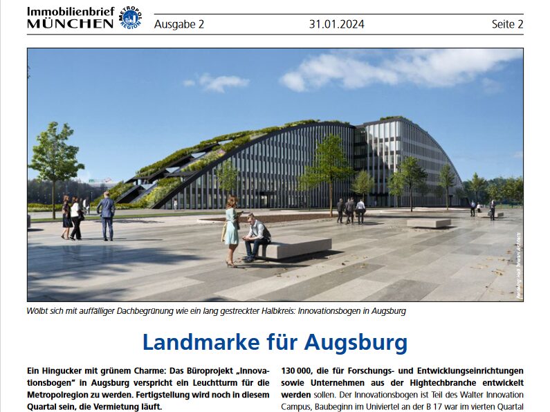 Als neues Fachmedium für die Metropolregion berichtet der Immobilienbrief München unter anderem über wegweisende neue Projekte und Stadtentwicklungsmaßnahmen, stellt Marktberichte vor, porträtiert Persönlichkeiten aus der Branche, berichtet über spannende Kongresse, nennt wichtige Transaktionen und personelle Veränderungen. Auf gleich drei Seiten wird in dieser Ausgabe über den Augsburg Innovationsbogen berichtet: Was macht das Gebäude so innovativ und nachhaltig? Welche Zukunftsvision gibt es für den Augsburg Innovationspark und den WALTER Technology Campus? Welchen Weltrekord hält der Innovationsbogen?
