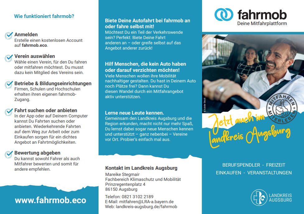 Mit der Mitfahrplattform „Fahrmob“ gibt es nun ein digitales Angebot, über welches Mitfahrgelegenheiten lokal vermittelt werden. Bürgerinnen und Bürger des Landkreis Augsburg können ihre Fahrten mit dem eigenen Pkw, welche ohnehin stattfinden würden, anderen Nutzerinnen und Nutzern zur Mitfahrt anbieten. Umgekehrt können auch Fahrgesuche eingestellt werden, um eine potentielle Mitfahrgelegenheit zu finden. Pro angefangene zehn Kilometer Strecke bezahlt der Mitfahrende einen Euro.