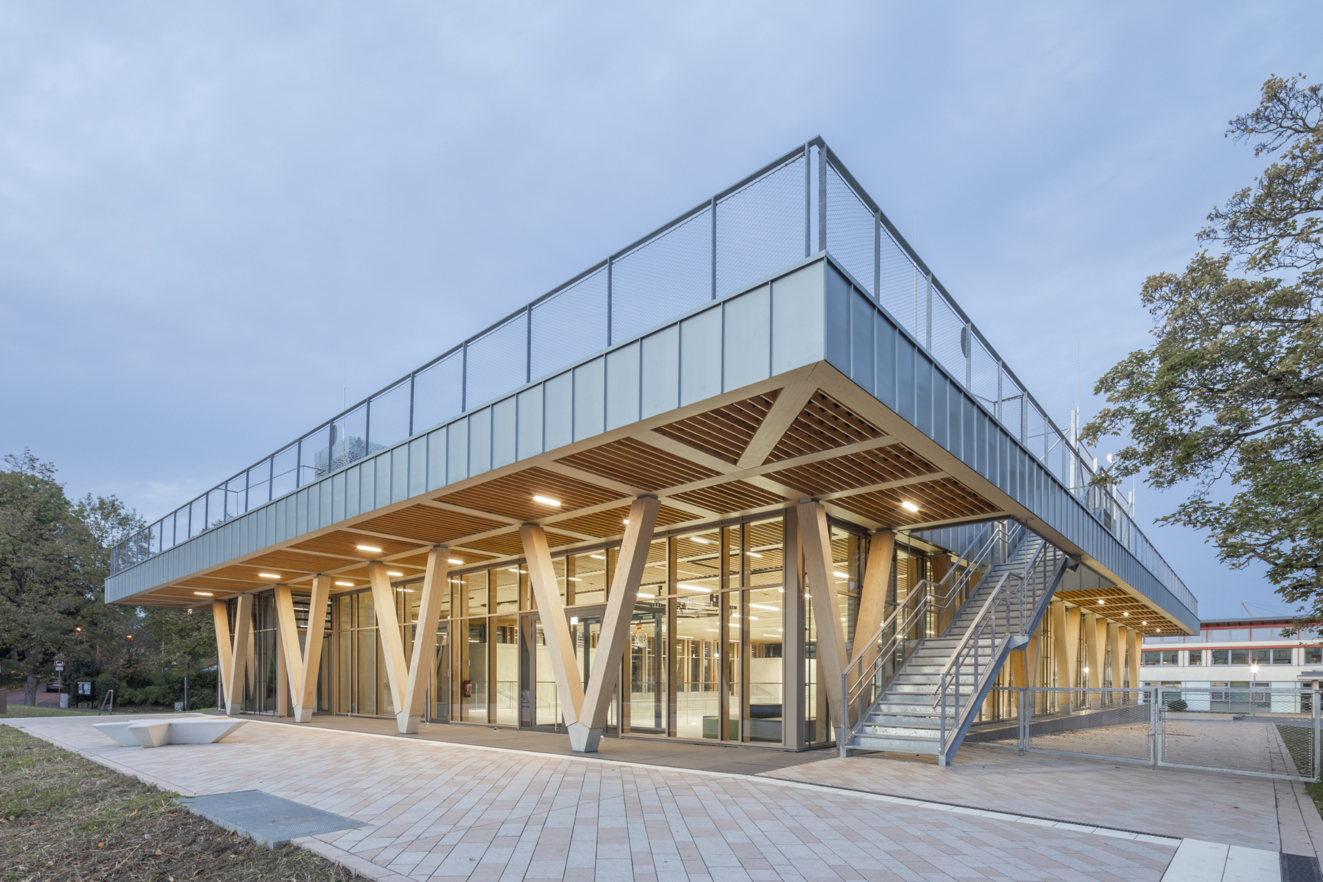 Die Gemeinde Alfter, in der Nähe Bonns, hat im Rahmen der Neugestaltung des Ortskerns einen neuen kommunalen Treffpunkt erhalten. Auf drei Etagen befindet sich neben einer unterirdischen Event- und Sportfläche, ein Café im ebenerdigen Eingangsbereich sowie ein Sportfeld und ein Fitnessberiech auf der schwebende Dachlandschaft. Die Fachwerkträger-Konstruktion aus Buchenholz schwebt auf V-förmigen Holzstützen. Hochgedämmte Gebäudehüllen sowie eine Wärmepumpentechnik unterstreichen den nachhaltigen Ansatz der Planung.