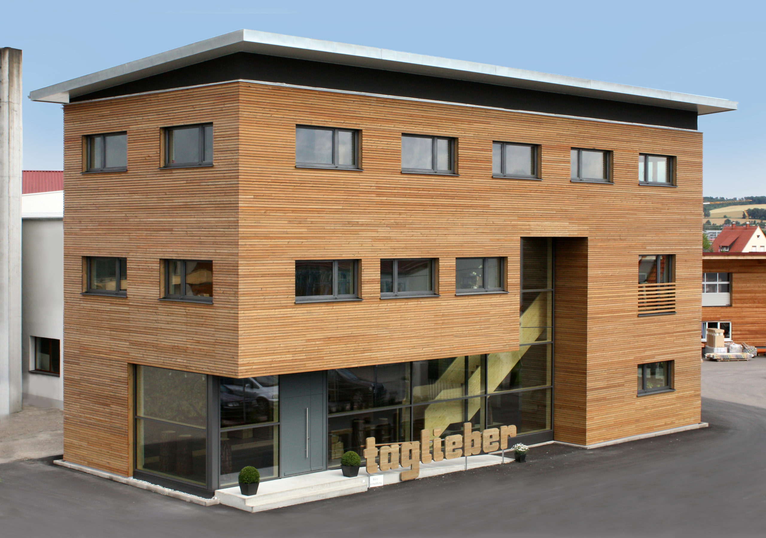 Taglieber Holzbau ist ein modernes Holzbauunternehmen mit den Unternehmensbereichen Holzhausbau, Zimmerei Sanierung, Schreinerei Treppenbau und Gewerbebau: computergesteuerte CNC-Maschinen in der Produktion, 3D-Vermessung und -Architekturplanung, hoher Vorfertigungsgrad im Werk in Oettingen.