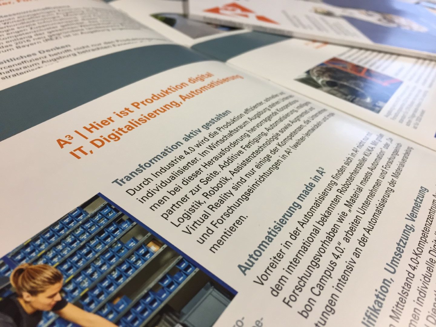Der Wirtschaftsraum Augsburg A³ ist ein idealer Arbeits- und Lebensraum mit Perspektiven. Hier finden Unternehmen und Menschen eine werteorientierte Zukunft. Mehr dazu in unserer A³ Imagebroschüre, die im November 2023 neu erschienen ist. Sie ist ein wichtiges Medium, um die Außenwahrnehmung des Standorts A³ bei Investoren, Unternehmen und Fachkräften zu stärken.