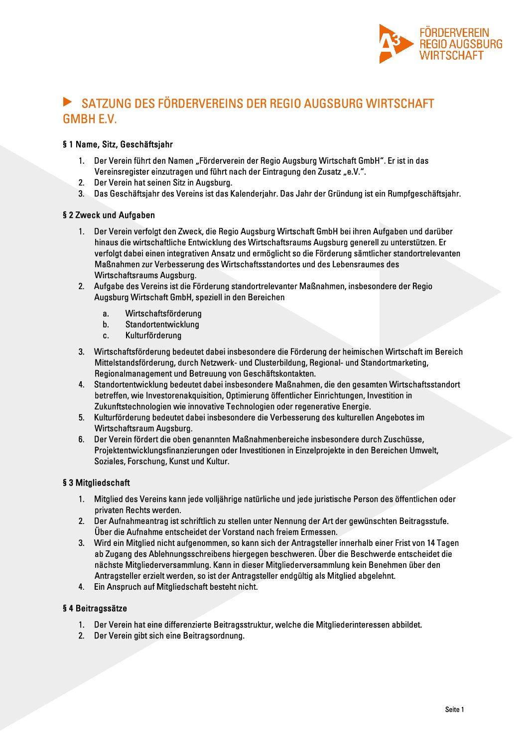 Die Satzung des Fördervereins der Regio Augsburg Wirtschaft GmbH e.V.