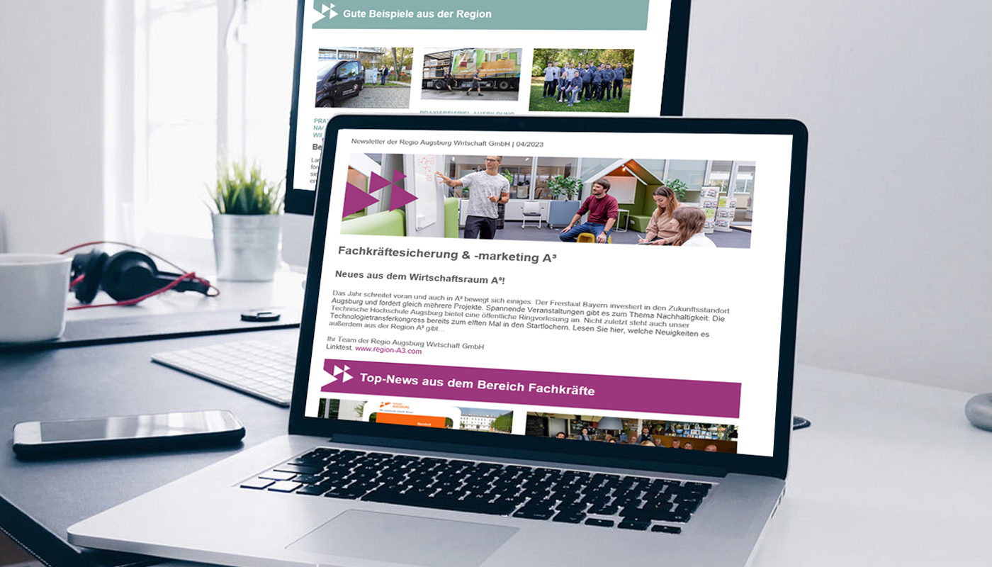 Sie möchten zu den Aktivitäten der Regio Augsbug Wirtschaft GmbH und mit aktuellen Wirtschaftsnachrichten aus der Region A³ auf dem Laufenden bleiben? Mit unseren E-Mail-Newslettern sind Sie immer up to date. Auch werblich können Sie unseren Newsletter für Anzeigenbanner nutzen.